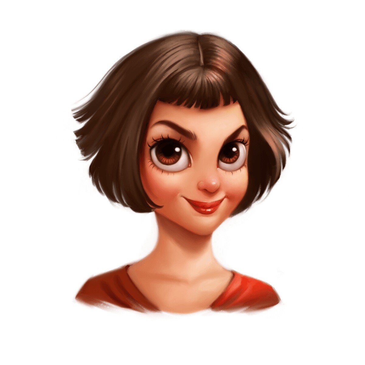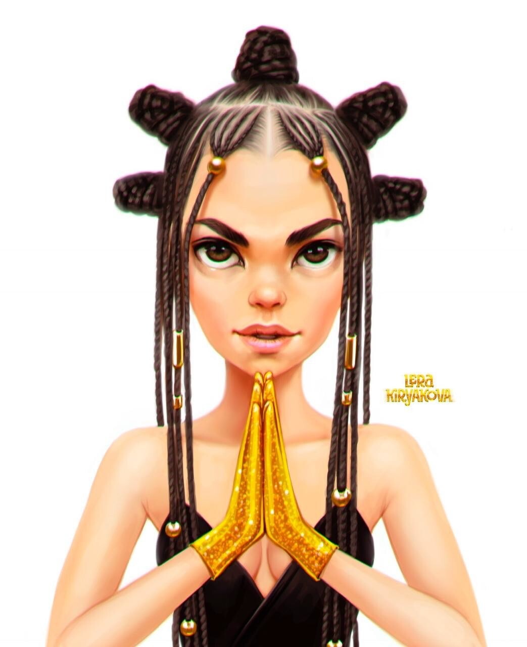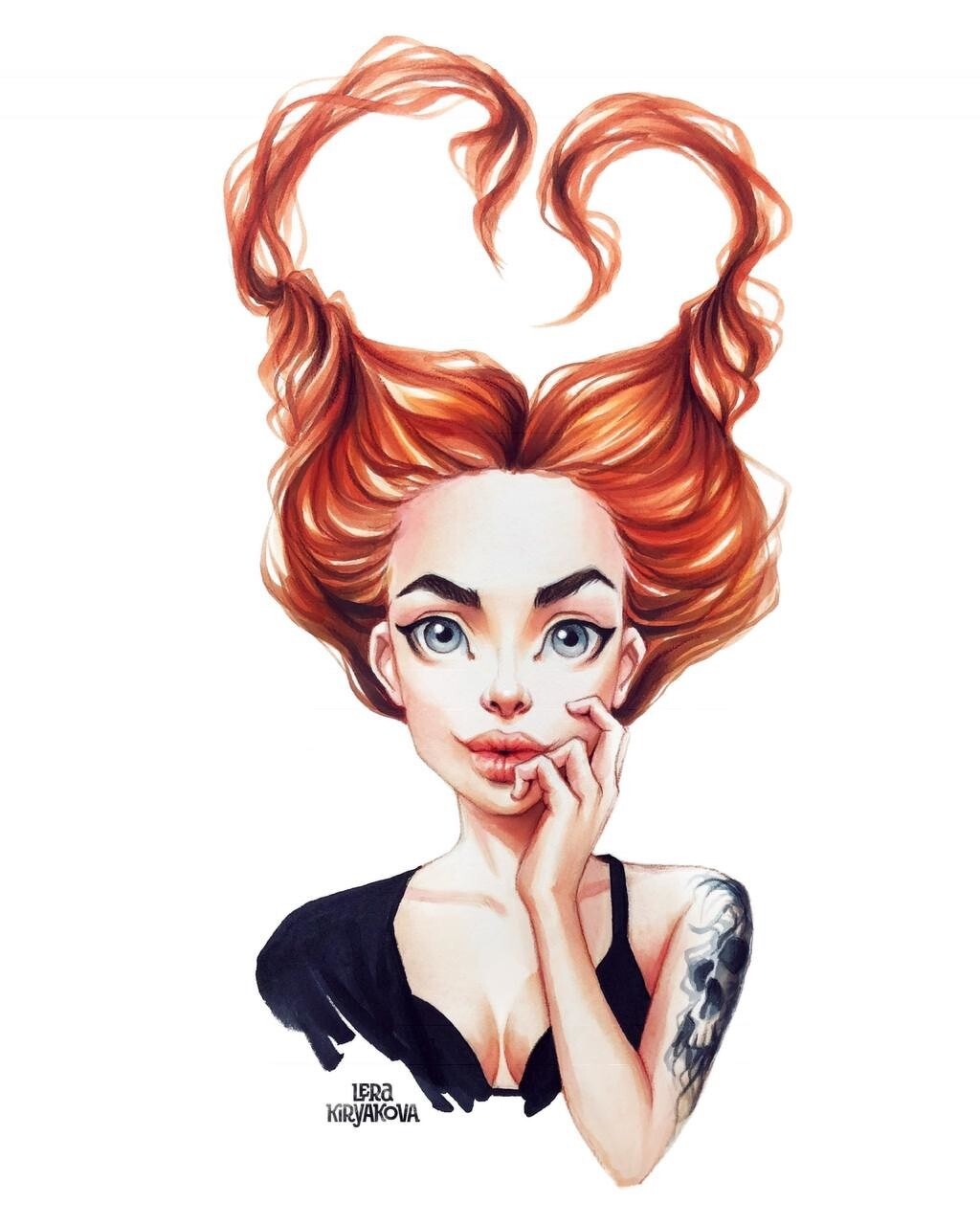 I try to work harder on characteristic features in my portraits: I make eyes bigger, eyebrows wider, face more roundish and the neck thinner to make it look as if it is from a cartoon. Meanwhile, I try to save the shape of the eyes, nose, mouth, and cheekbones because it makes a person`s appearance more recognizable.